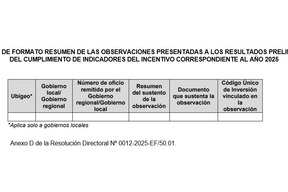 2. Los gobiernos regionales y locales pueden presentar observaciones a los resultados preliminares, siempre que estas se orienten a demostrar el cumplimiento de los indicadores conforme a lo establecido en las fichas técnicas del IPI-Inversiones 2025. Cabe señalar que, durante el proceso de evaluación de observaciones, no es posible subsanar el cumplimiento de los indicadores.