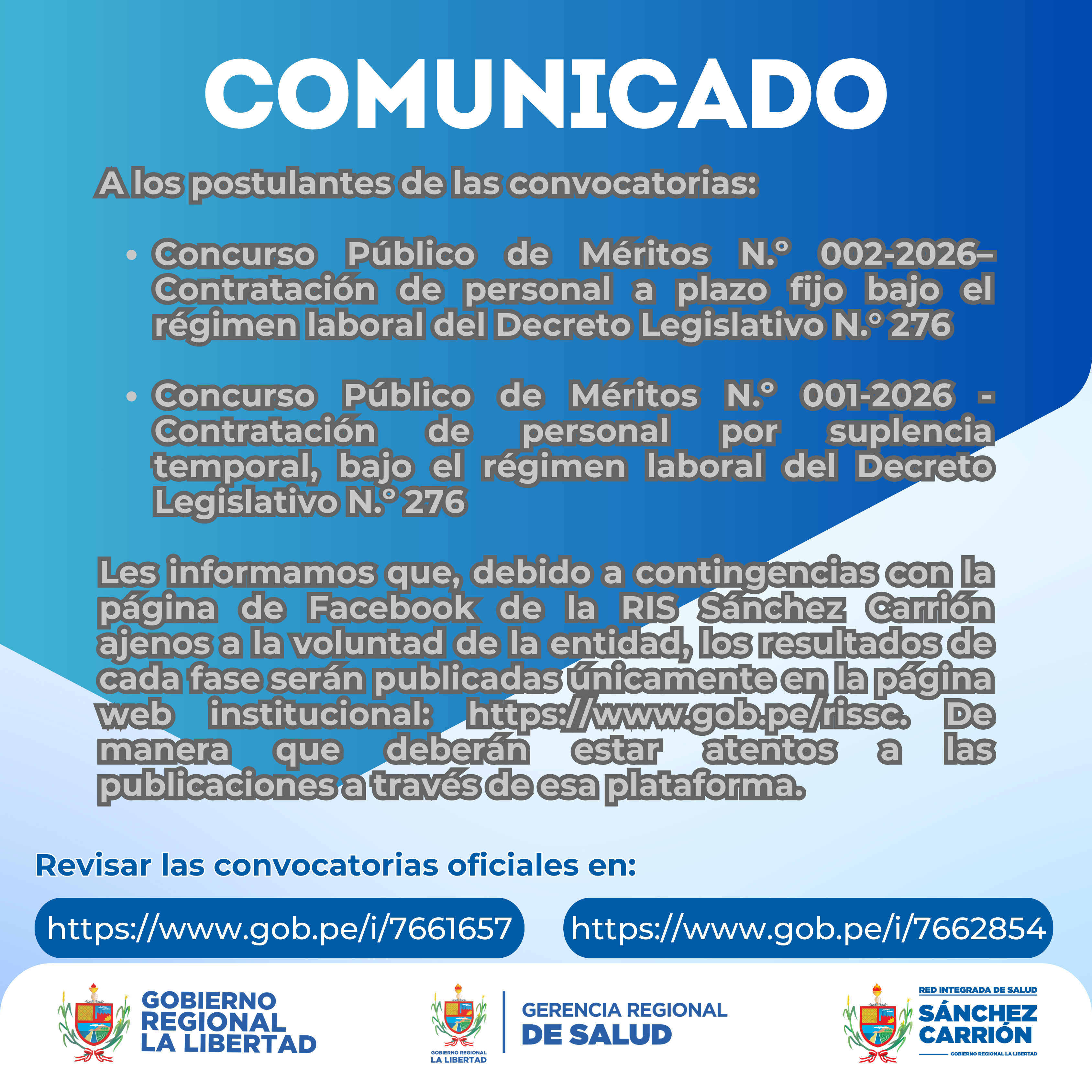Comunicado sobre la publicación oficial de los concursos públicos de mérito únicamente en la página web oficial de la RIS Sánchez Carrión